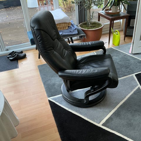 Læderlænestol, læder, Flex Lux, Super lækker mørk chokoladebrun lænestol i kvalitetslæder og valnødde finer. Model Savoy fra Flex Lux. Skammel medfølger. Kun 2 år gammel. Stand som ny. Indstillelig nakkestøtte, dreje og vippefunktion.
