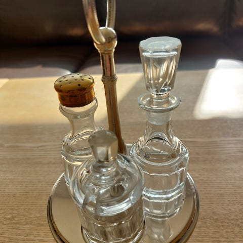 Andet, Plat menage, Flot gammel plat menage i sølv (plet) med plads til fire flasker. Er blevet brugt til salt, peber og dressinger, men kan også bruges til andet efter eget valg. Har en fin udskåret kant på det midterste brede stykke. Sælges for 300 kr.