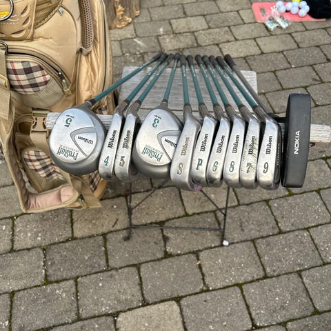 Kølle, stål, Wilson, Ældre golfsæt til kvinde: to køller, hhv. nr 3 og 5 plus tre jern hhv. 6, 8 og S, Lady Pro Staff. Desuden jern nr 9 af andet mærke (Titleist?). Sælges gerne samlet for 500 kr. Pæn ældre bærebag med skulderstropper og ståben kan tilkøbes (se separat annonce).