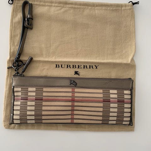 Burberry Clutch i sort lak (Made in Italy) med den kendte sølv hest på forsiden. Tasken har et stort rum, der bliver lukket med en lynlås og et stort lynlås-håndtag. Derudover har den et håndtag/bærestrop der ligner et bælte sat på en kæde, så man kan bære tasken fx. om håndledet. Dette håndtag kan lukkes ind i tasken, så man får et mere clean look på tasken.