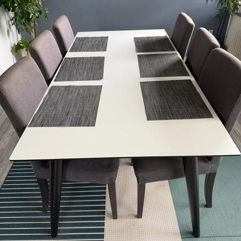 Flot stort, hvidt spisebord til 6 personer. Der medfølger 2 tillægsplader på hver 45 cm og 6 stole.