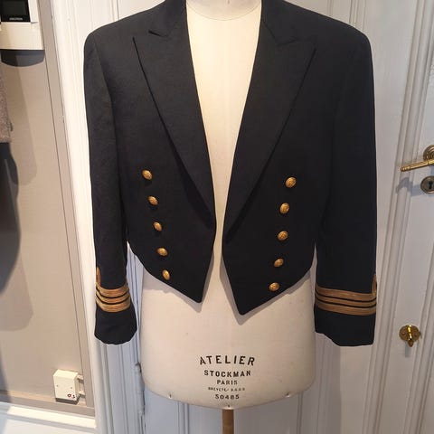 Uniform, Messeuniform for flåden, Skræddersyet messeuniform, syet til en selvbeklædende flådeofficer i fornem kraftig uldkvalitet hos skrædder Henry Lampe, Court Adelers Gade, København K, i 1954.