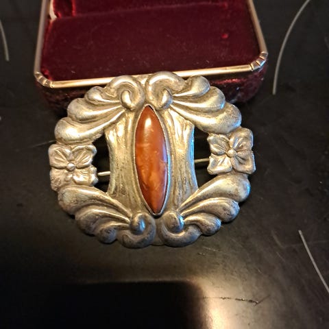 Jugend broche i sølv med rav indlæg (2cm) og en ravdråbe i sølvfatning (3 cm)