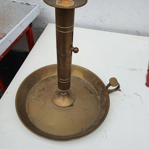 LYSESTAGE til tykt lys - massiv messing (over 1 kg, Meget tung messing lysestage - vægt over 1 kg. Hullet i stagen passer til lys med en diameter på 3,5 cm. Ca. 6 cm høj og diameter foroven er 6 cm og i bunden 12 cm