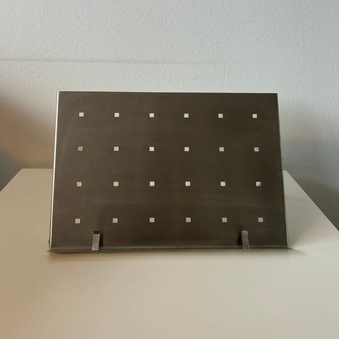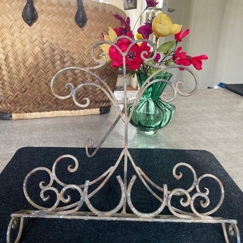 Kogebogsholder / bogholder / bogstativ, antik i sort metal. Ca. 43 cm høj. Øverste venstre "blad" har en fejl - se foto. Jeg sender med BRING og modtager Mobile Pay.