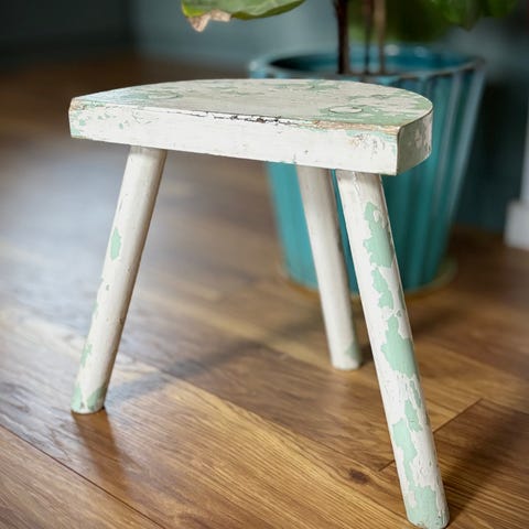 Fin lille skammel i flot vintage stil. Den er betrukket med intakt rødt skai med hvid kant, og står på alu-stel. Måler H: 47cm B/D: 30cm