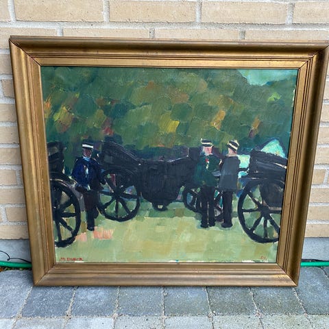 GIV ET SERIØST BUD Oliemaleri, Jeppe eisner, motiv: Dyrehavsbakken, b: 111 h: 106, "Spilledjævlen" fra 1972 olie på lærred guldramme medfølger i perfekt stand afhentes I hellerup