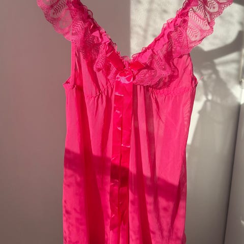 NEDSAT! Ægte vintage babydoll natkjolesæt med trusser fra tresserne, i god stand, især alderen taget i betragtning. Består af to lag, pink inderst og hvidt yderst , så den er halv-gennemsigtig. Jeg er sikker på at søde ægtemand blev glad, når hun iførte sig denne lille sag.