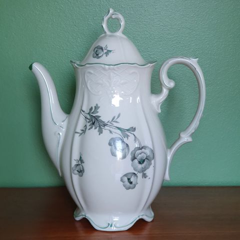 Porcelæn, Kande, Smuk charmerende kaffekande fra Københavns Porcelains Fabrik Danmark. Den har grønne farver og mønster og med blomstermotiver langs kanten foroven.