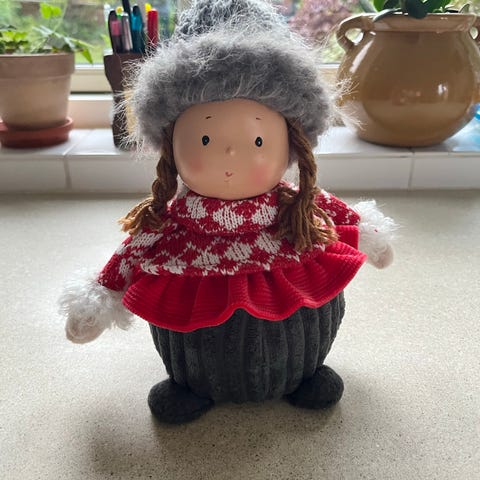 Nissepige, Ca. 17 cm med nissehue. Med porcelænshoved. Sender gerne med dao for købers regning eller kan hentes I Søborg.