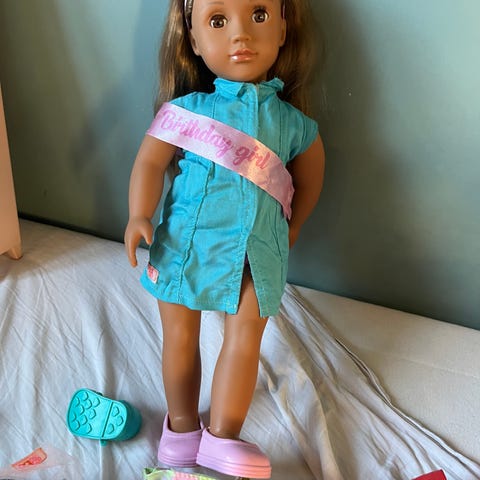 Andet, oue generation, 2 dukker som har stået til pynt 45- 46 cm høje den med lyst hår har blåt hår indenunder og en stol stol pris samlet 200 kr