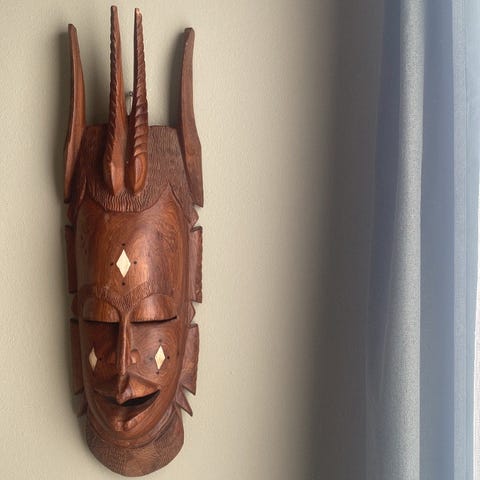 Ophæng til væg, Maske i træ fra Ghana længde 47cm.