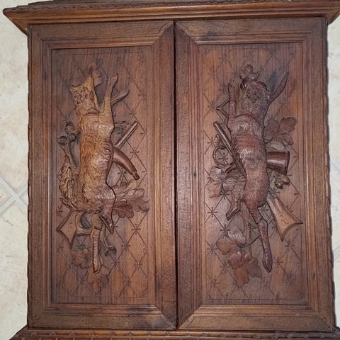 Jagtskab, b: 90 d: 51 h: 209, Superflot og restaureret jagtskab. Præcis alder ukendt, men det er langt over hundrede år gammel og dermed antikt.