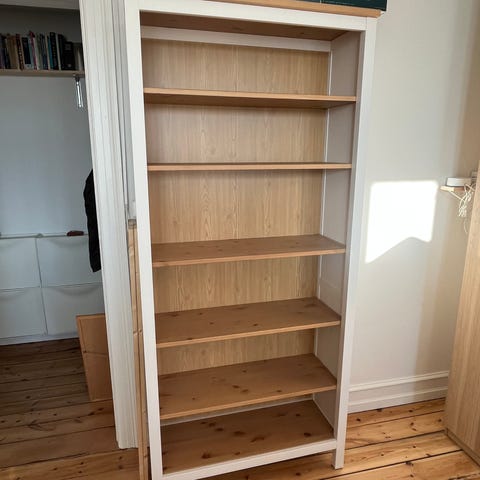 Har en del skrammer så den ville have godt af at blive slebet ned og få ny maling, men det er en god, solid reol.