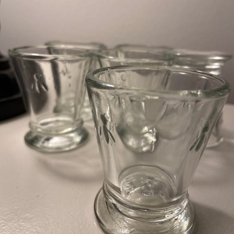 Glas, Drikkeglas, La Rochère Abeille, 7 flotte vandglas med bier. Der er fire bier på hvert glas.