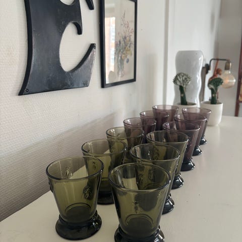 Glassene er fra Frankrig og måler ca. 8 cm i diameter ( åbningen ) og ca. 10,5 cm i højden.