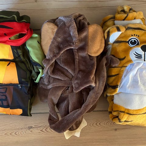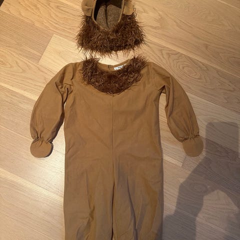 Udklædningstøj, Fastelavn udklædning kostume løve, Ukendt, Helt bedårende løve-kostume fra røgfrit hjem. Med poter og fødder, uden slid. Trykknapper i ryggen og ved løvemanken. Kostumer er lavet til at bære uden på andet tøj og sko.