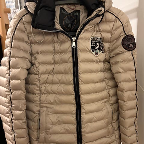 Dynejakke, str. 40, Napapijri, Blank Sort, Polyster / Dun, Næsten som ny, Flot Lang Dun Jakke i Blank Sort St L /40. Fra Napapijri Med 2 stik lommer foran. og med rip kant i kraven Velholdt stor ny Pris.