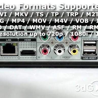 AVI, MKV, TS, TP, TRP, M2TS, MPG, MP4, MOV, M4V, VOB, ISO, DVD-ISO, IFO, DAT, WMV, ASF, RM, RMVB, FLV up to 720p, 1080i, 1080p, BD-ISO