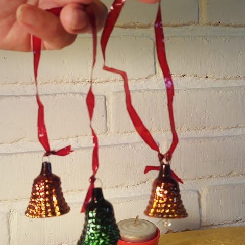 Glasklokke vintage, Lille fin vintage klokke, der kan ringe. Sølv, blå ig hvid med sne. H6,5 cm.