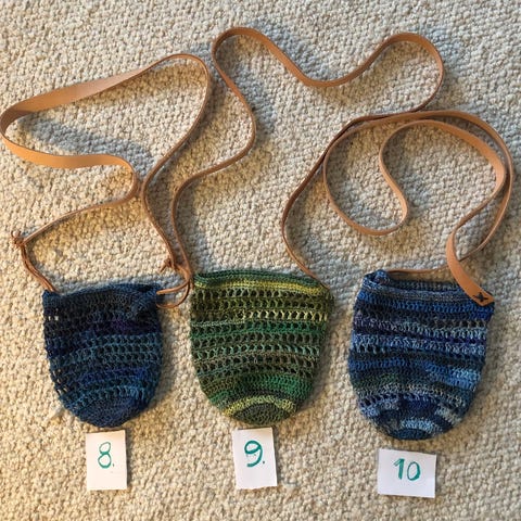 Anden taske, Hæklede tasker, Hæklede tasker i forskellige størrelser, materialer og farver.