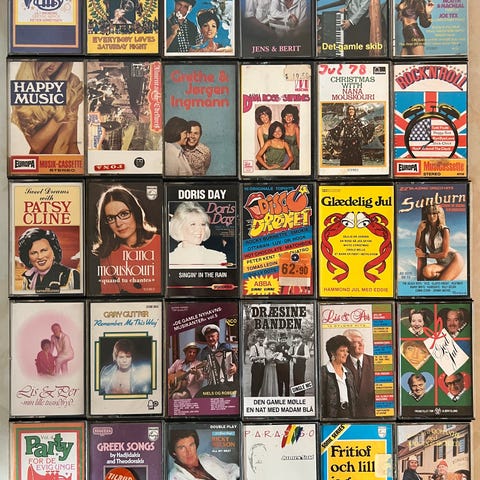 Mange kassettebånd - 22 stk, i bokse med cover og 6 løse kassettebånd - kan dog leveres i neutrale kassetter uden cover.