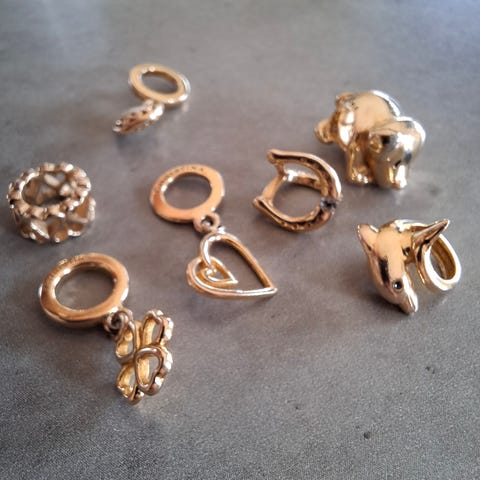 Charms, forgyldt, Christina Watches, 4 charms i forgyldt sølv fra Christina Watches. Nypris: Marguerit kr. 449. Hjerte kr. 449. Stopper - glat kr. 99. Stopper med hjerter kr. 249. Ialt kr. 1 .246.