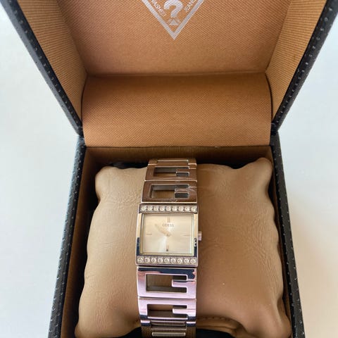 Dameur, Guess, Super smukt dame armbåndsur - nærmest et smykke / armbånd med sten mv - ekstra led medfølger - brugt få gange.