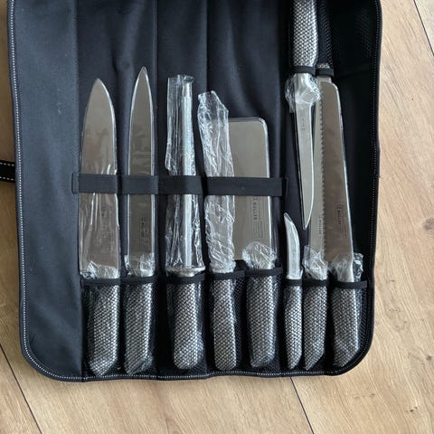 Knivsæt, Fischner s.g, Fischner s.g. knivsæt af holdbar stål bestående af 9 dele. Ubrugt i original emballage. L. fra 20 til 39 cm