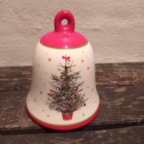 Porcelænsklokken er fra starten af 90erne og har snor til ophæng.