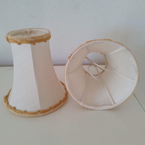 Lampeskærme , 3 guld/okker, 3 hvide, 1. Hvid 'rynket' stof, 15 cm høj, 14,5 forneden, 9,5 forneden, 40 kr ikke klem