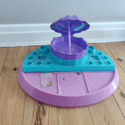 Smykkefremstilling: Shimmer 'n Sparkle armbåndsmaskine. Lav flotte snoede armbånd med denne maskine. Du skal blot hægte de farverige tråde og perler på, sætte Twist 'n Wear maskinen til at dreje og se, hvordan den snurrer og fletter. Skab dine egne farvekombinationer, lav armbånd, hårtilbehør, bogmærker og meget mere. Bare snor, perler og lad maskinen sno. Brugt få gange. Der er masser af snor og perler tilbage.