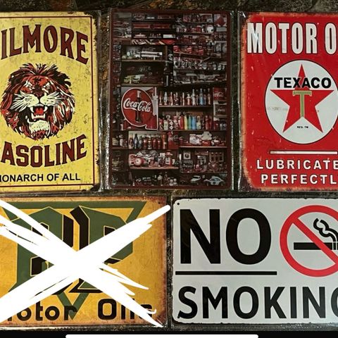Skilte, MetalSkilt / metal skilt, Shell Auto Oil, Shots, 7Up, Coca-cola, Texaco motor Oil.