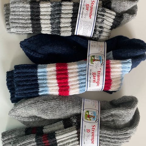 Strømper, Hjemmelavet. , str. 40-43, Blåstribet, sort, råhvid, blå. , Strømpegarn. , Næsten som ny, 4 par hjemmestrikket sokker.