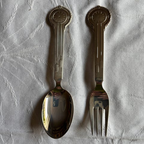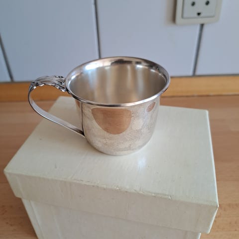 Sættet består af en dyb tallerken (ca. 18cm i diameter) servietholder (ca. 5,5cm*3,5cm) og ske (ca. 13,5cm), hele sættet kommer i den originale gaveæske. Alle tre dele er pletsølv.