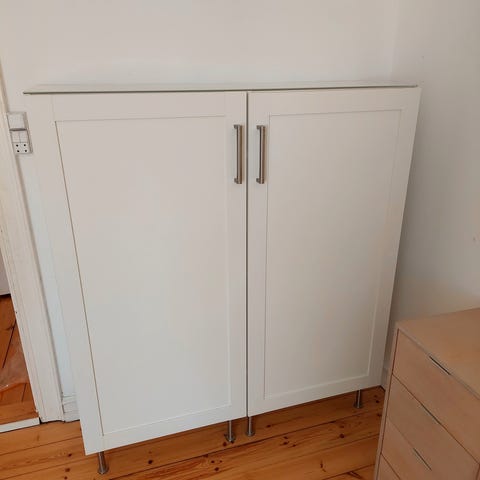 Vægskab, Ikea, b: 160 d: 39 h: 42, Har disse væghængte skabe/skænke/reoler med en fin glasplade ovenpå. De er med hængsler til væggen. Man kan også købe ben til dem og have dem stående på gulvet. Der er skåret hul på bagbeklædningen i hver del da ser var kontakter der. De er bygget op af 2 dele (se billeder). Så kan evt opdeles i andre mål hvis man ønsker dette. Dog er glaspladen 160 cm. lang. De er taget ned og nemme at bære, så lige til at tage med. Højde: 42 cm. Dybde 39 cm.