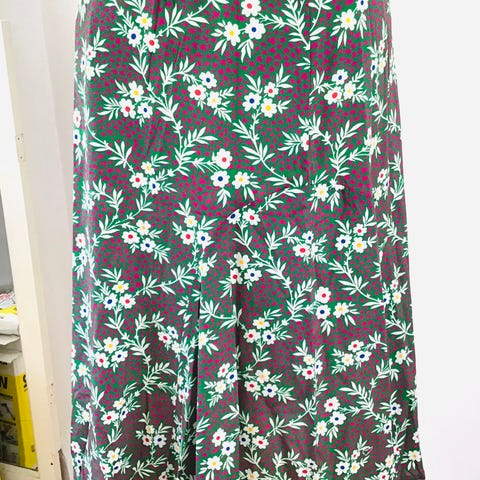 Beautiful skirt in a slight A-line shape, so it doesn't fit too tightly. Zipper on the side. There were 5 black decorative buttons sewn onto the waistband, which I have removed, but they are included if you’d like to sew them back on. Worn sparingly.