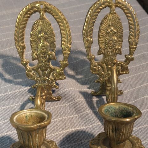 Lysestager, Daniel Møller, To meget smukke gamle vægstager i messing med pynt af stribede lyse stråperler.