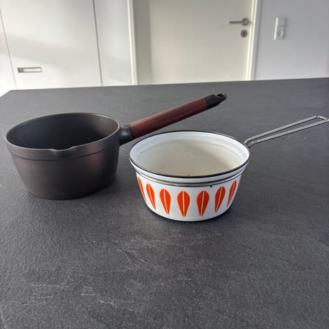 Kasserolle, Lotus Cathrineholm, En sjældnere set Lotus kasserolle i den flotte gule med teakhåndtag. Ø 22 cm. Den har 2 små afslag indvendigt og 1 udvendigt. Se billederne. Den befinder sig i Næstved og kan sendes.