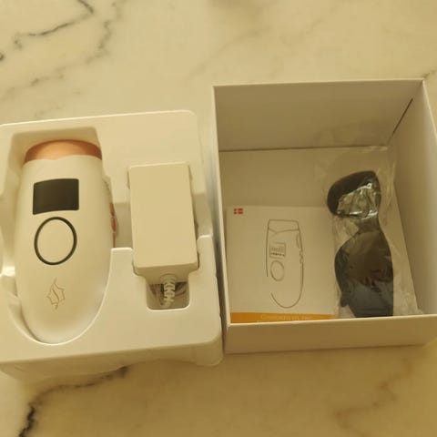 Bestope IPL hårfjerner i hvid og sort. Enheden anvender IPL-teknologi til effektiv hårfjerning. Pakken indeholder en oplader, beskyttelsesbriller og en manual. Ideel til hjemmebrug.