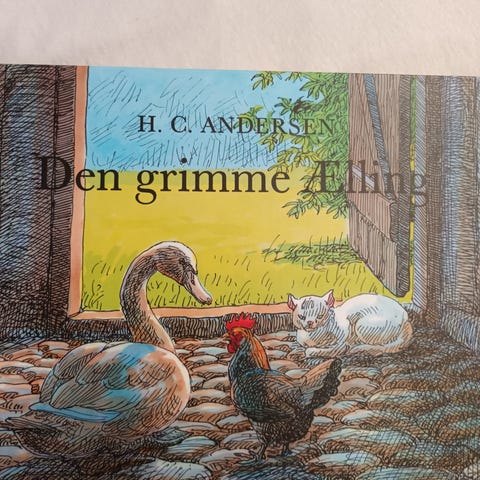 Den grimme ælling får nok at se til, da bogen den er i får besøg af en farlig krokodille. Mon det kan lykkes at komme af med krokodillen igen? Ordene på titelsiden "Den grimme ælling Hans Christian Andersen" overskrevet med Åbnes meget forsigtigt