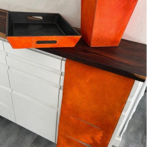 Morgenbakke med servietholder, Koskind, Smuk bakke samt servietholder i orange koskind