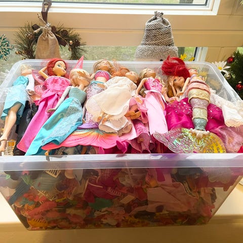 Barbie, Barbie, Kæmpe Barbie-pakke med 12 Barbier, 2 Ken, møbler, hest, sko, børster, tasker og køkkenudstyr.