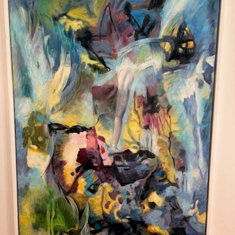 Oliemaleri, Freddy Jensen, b: 50 h: 68, Freddy Jensen (1944-2018) , “blå” titel og signatur anført med blyant bagpå lærred - lidt svært at se på foto - kan ses i Bornholms kunsthandel - giv gerne et bud - kan sendes