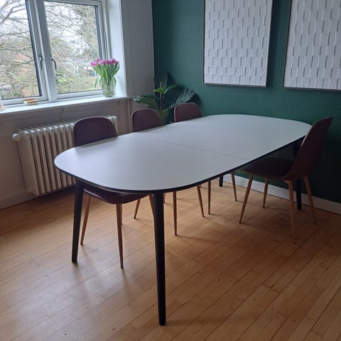 Spisebord, b: 105 l: 200, Jeg fik købt spisebordet for 2 uger siden for 4000kr. Men den kan ikke returneres fordi den skal være i den samme papkasse den kom med, og den er desværre blevet smidt ud. Jeg skal ikke have bordet fordi den er for lang til min lille stue, og derfor må sælge den.