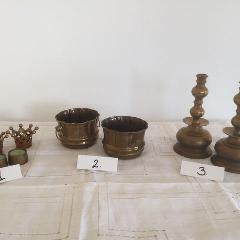 4 smukke ældre messing fyrfadsstager samt skøn Hjerteskål