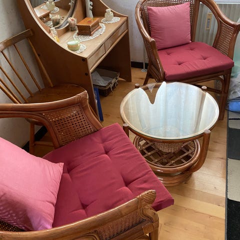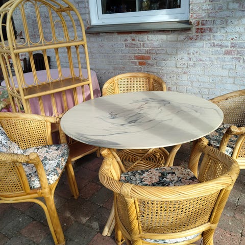 Man sidder godt i stolene og bordet er robust selvom det er i flet. Sælges samlet