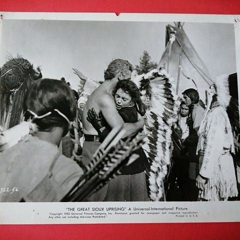 Foto, Pressefoto fra filmen "The Great Sioux Uprising" 1953., Faith Domergue. Slidte hjørner.