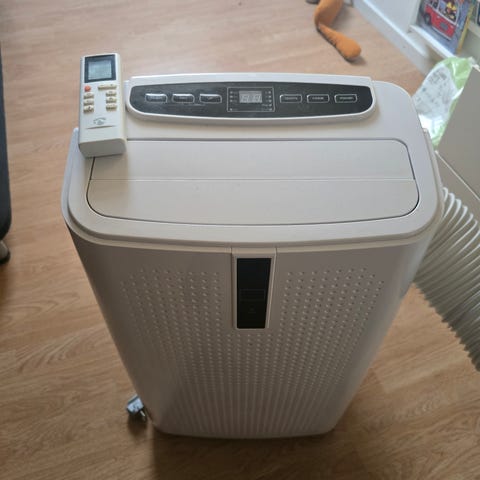 Aircondition, Nedis, Luftkøler 80W med 2 tilstande (blæser/luftkøler) i hvidt design med hjul og fjernbetjening.