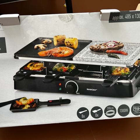 raclette-grill bordgrill, Tefal, Virker som den skal, dog er nogle af bakkerne lidt ridset, som kan ses på billedet. der kan købes nye, hvis det er et problem.